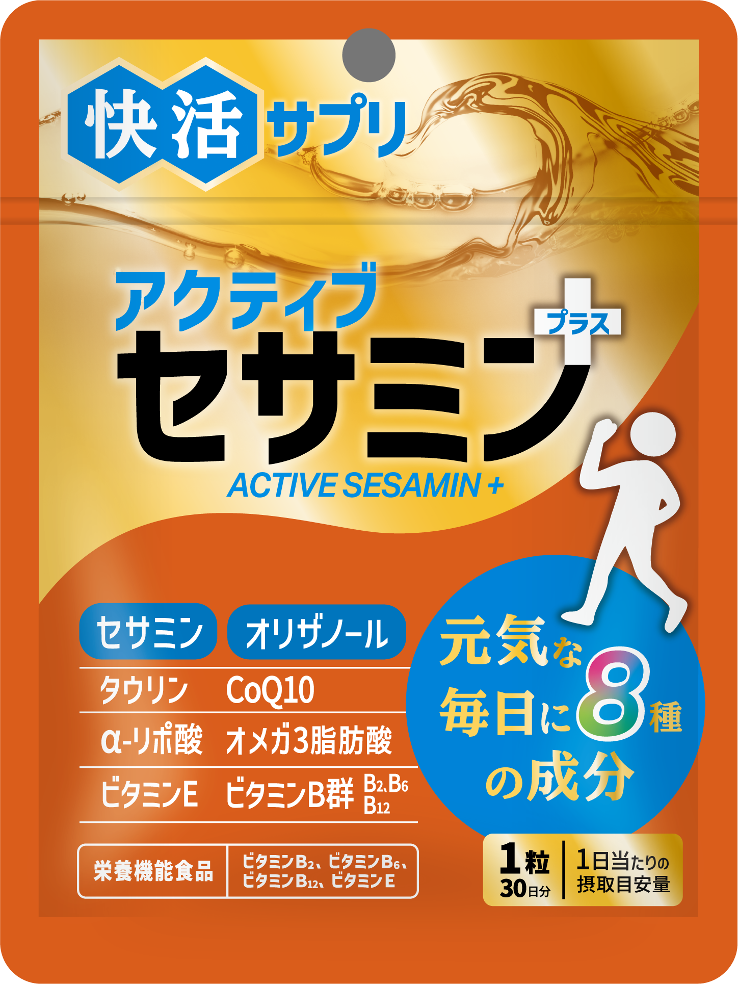 本商品は「セサミン」に、元気の成分7種類(オリザノール、オメガ3脂肪酸、タウリン、コエンザQ10、α-リポ酸、ビタミンB群)を加えた8種類の成分を1粒にギュッとまとめた “やる気” “元気” をサポートするサプリメントです。